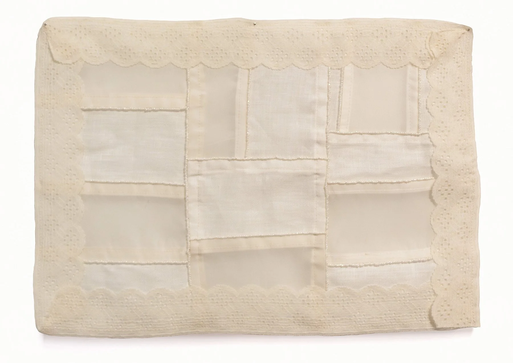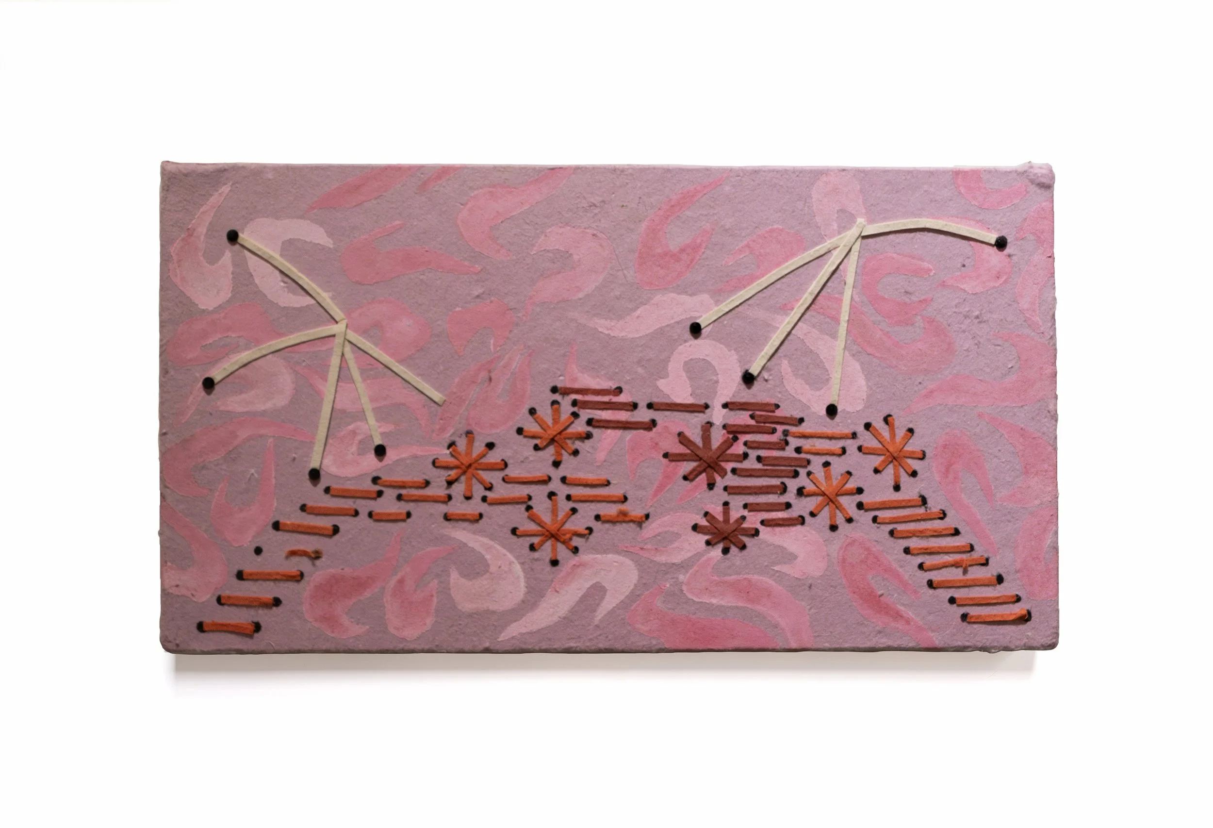 Self-portraits As The Strings Tying Us Together is a collaboration between Caroline Honas, Hùng Lê, and Bernadette Negrete that foregrounds process-driven artistic practices. Each substrate started in one of the three artists' studios, encountered various manipulations, and was then passed to one another for completion—or was created through the direct inspiration of one another’s work. This approach inspired a broader understanding of the methodology and aesthetics defining each artist’s practice, allowing the accumulated pieces to act as portraits of their relationships. During these encounters, content is set aside and replaced by process. Each piece is transformed, becoming a record of all three artists’ hands and the trust built between them over time. The result is a collage of sewn paper bricks, beaded paintings, and layered works that ask us to challenge the repeatedly centered individualistic approach in favor of collaborations.